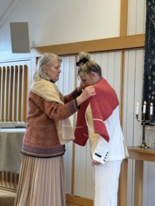 Þórdís djákni færð Guðrúnu biskup friðartrefil að gjöf sem hún sjálf hafði prjónað